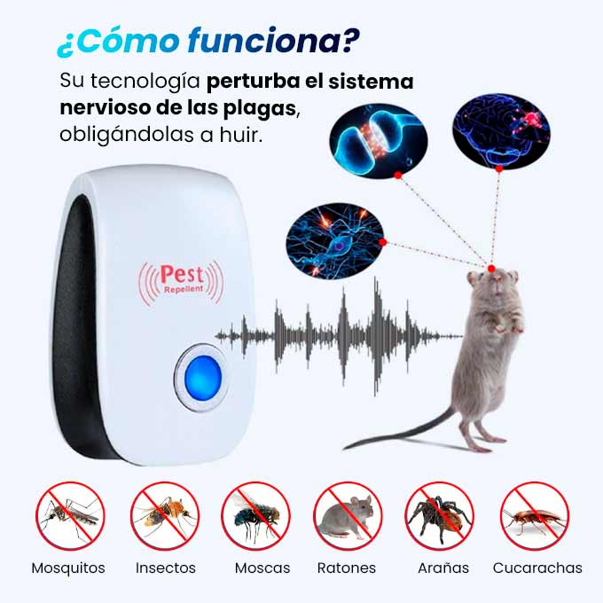 Emite ondas de alta frecuencia que resultan molestas para insectos y roedores, ayudando a que se alejen del área sin necesidad de químicos, trampas ni contacto directo.